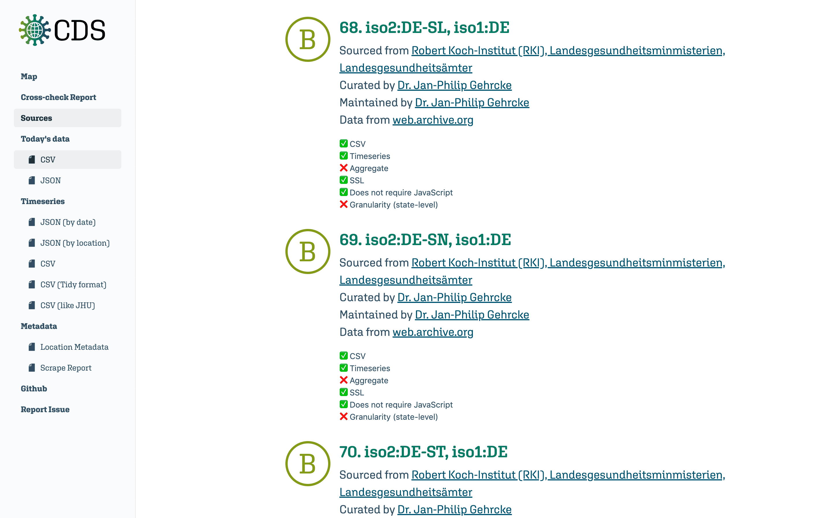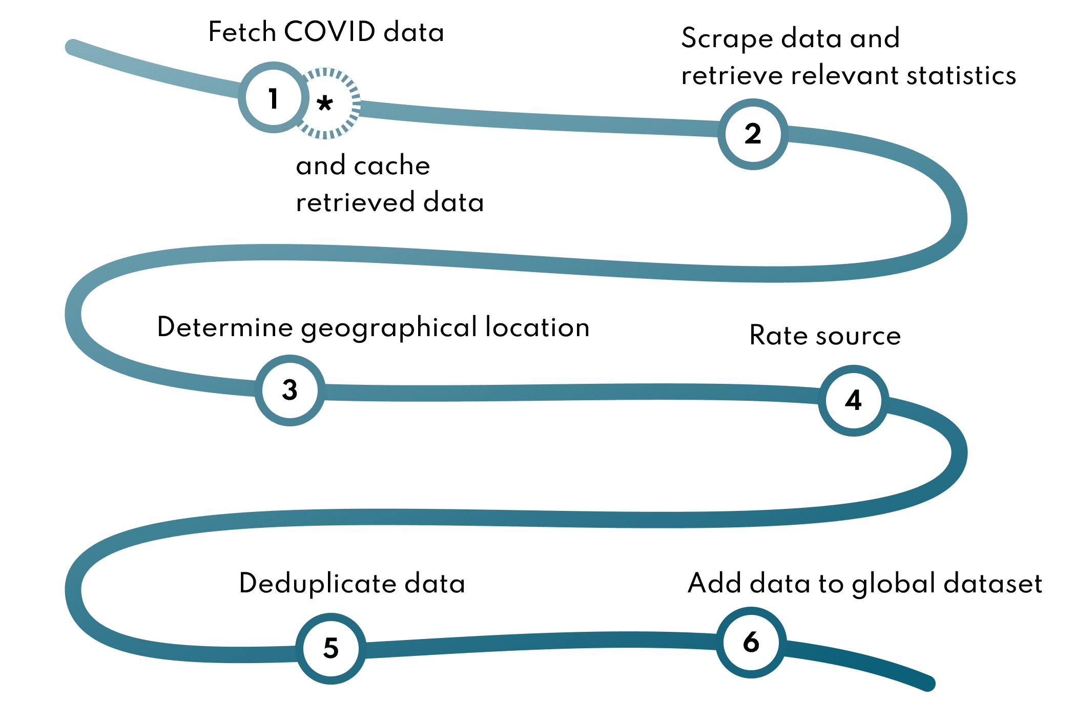 The scrapper runner supported multiple sources and scrapers for the same geographical location. This allowed us to rely on the John Hopkins dataset as we grew the number of scrapers available for example. However, only one data-point could be included in the final dataset. We used the rating of each source to select which source to include in the final dataset.