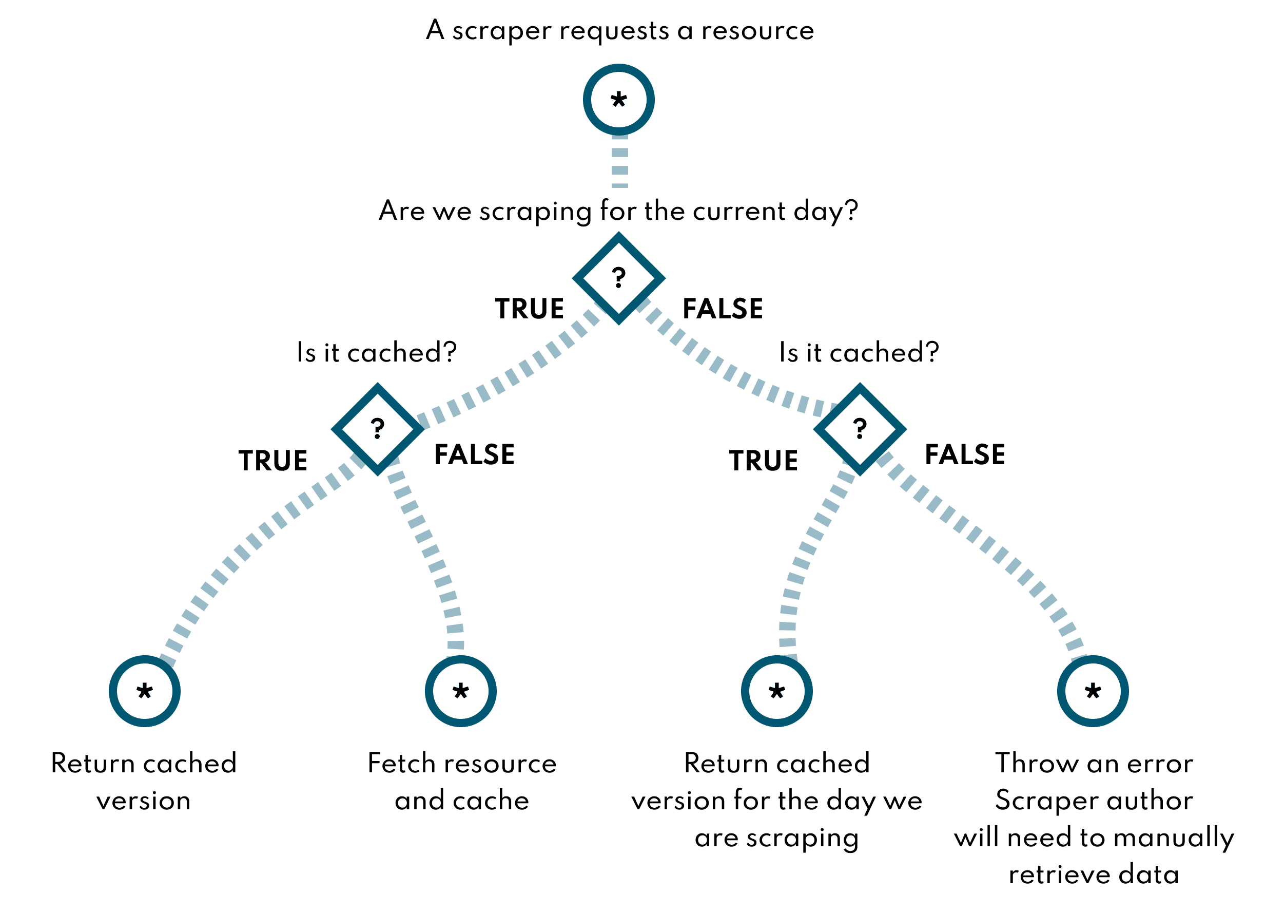To address these issues, we cached all pages fetched by each scraper. This way, if a scraper failed, the scraper could be fixed and could then be run on the cached page if the original page was no longer available.