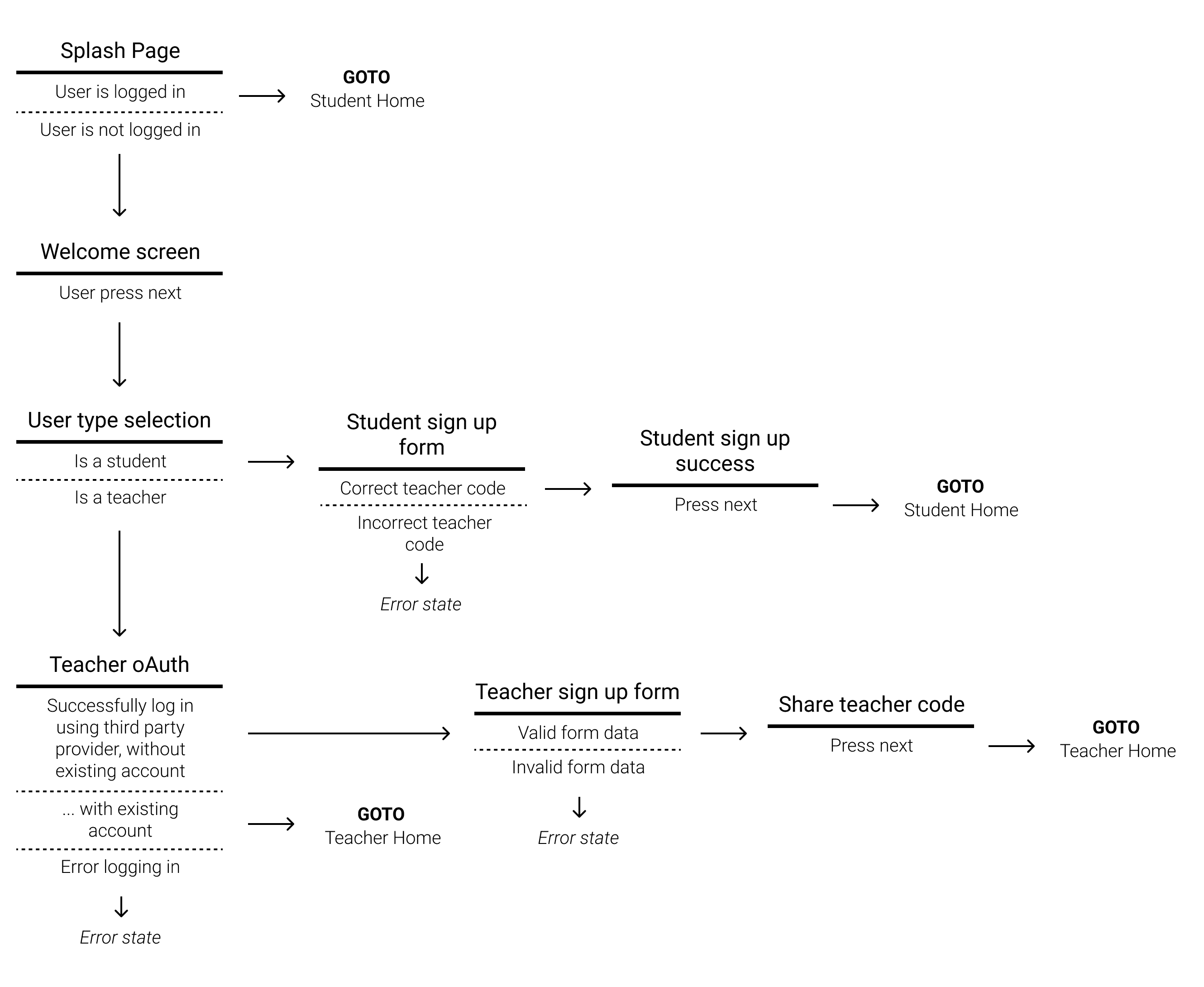 I was responsible for implementing the mobile app. This sketching approach was inspired from a Signal v. Noise article✱I started by sketching a potential user flow for the authentication process and for the main features of the student app.