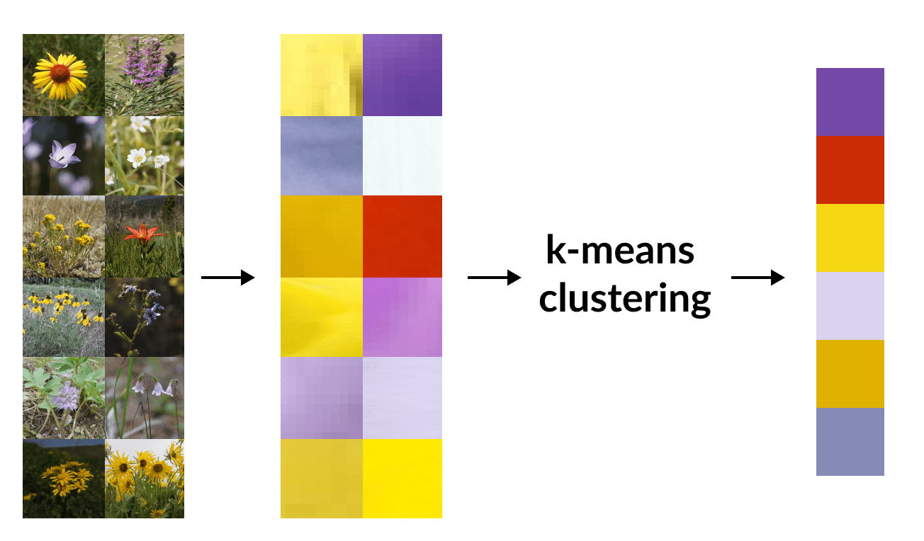 Left with only the hue and saturation component of each pixel, we applied k-means, with k=6, to retrieve a list of 6 colour values and the standard deviation of each cluster associated with flower pixels. These colours and deviations were used when conducting color thresholding on new images.